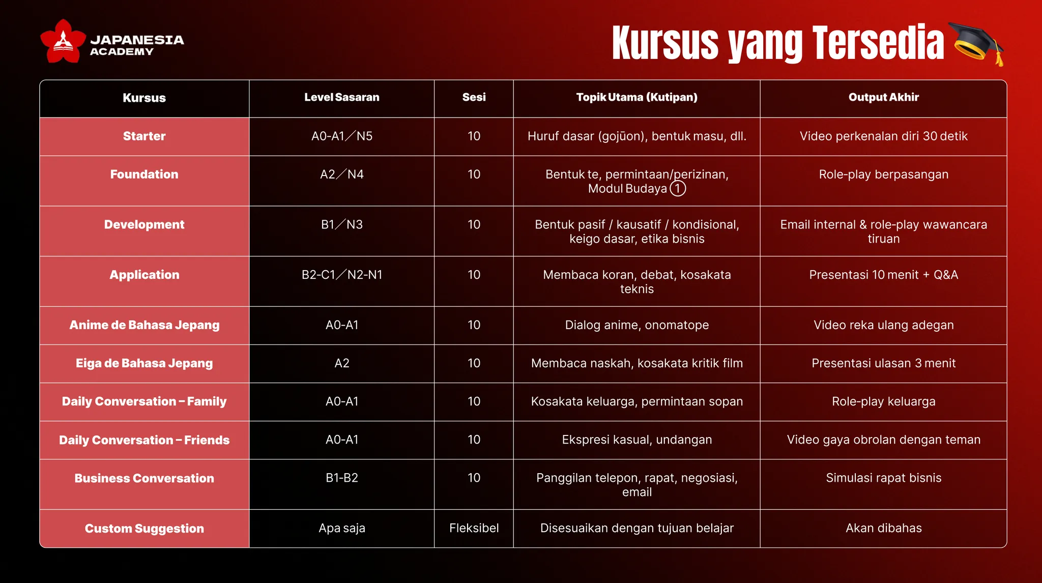 A hybrid Japanese-language program for professionals and university students in Greater Jakarta, combining weekly offline classes with an always-on learning community.